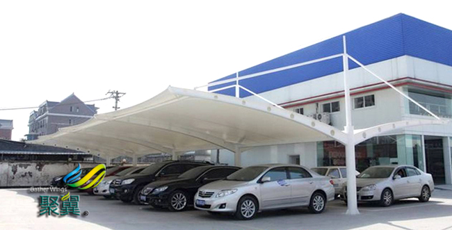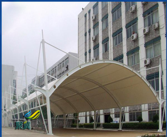 由于膜結(jié)構(gòu)車棚膜材具有清潔膜結(jié)構(gòu)的保護膜,可以使膜結(jié)構(gòu)車棚建筑具有良好的自清潔效果,同時保證了膜結(jié)構(gòu)車棚建筑的使用壽命.
