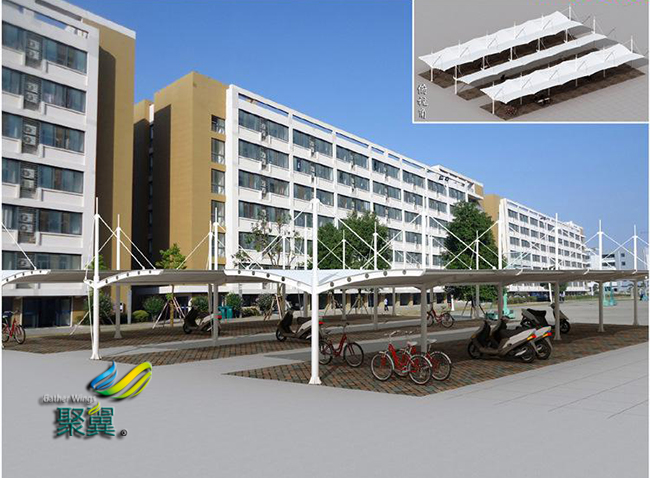 膜結構車棚在美觀度上可以很好的適應,同進膜結構車棚的使用時間也最長,像這種骨架的最長壽命可以達到三十年以上,正是因為膜結構車棚有這樣的優勢,適合長久性自行車棚的搭建。