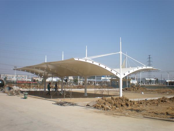 膜結(jié)構(gòu)車棚材料上,通過(guò)支撐和張拉索就能構(gòu)成。所以膜結(jié)構(gòu)車棚可以通過(guò)自身柔美的曲線和周圍的藝術(shù)景觀結(jié)合起來(lái),給人以美的享受。
