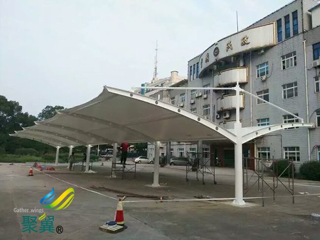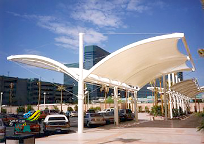 膜結構車棚的側面的是多為90°的,是在使用過程中是很難是避免造成雨水的痕跡。對膜材料自潔性的評價,是將膜結構車棚膜材料進行室外暴曬試驗,然后用分光光度計測量暴曬前及暴曬后膜結構車棚膜材料的可見光反射率,用得出的色差來進行評價,膜結構車棚會越來越美觀,也會被人們更多的使用。
