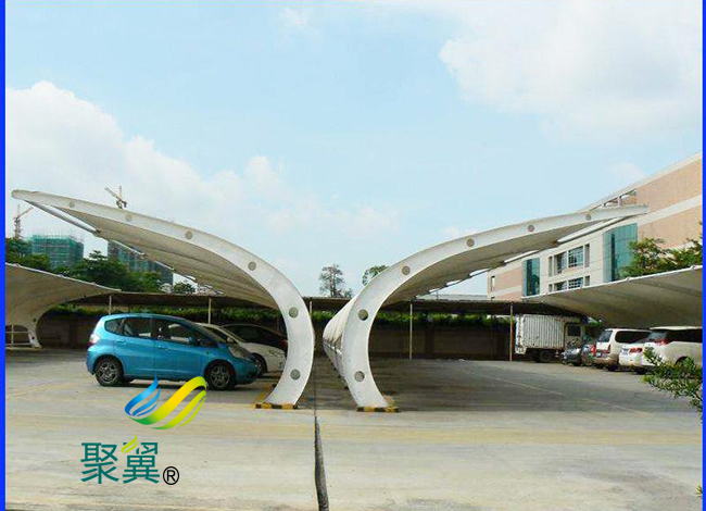 預張力和二次張拉,膜結構車棚的穩定依賴于膜結構內的預應力的保持。預應力的水平影響膜在荷載作用下的變形。因為膜結構在荷載的持續作用下會產生松弛,所以在使用期間膜結構車棚膜內預應力會發生變化。用于特定結構的膜材性能可以通過雙軸實驗來確定,并應用于預應力設計中。處理膜結構車棚膜材在使用期間產生的松弛和徐變的處理方式有兩種,其一是安裝時施加一個較高的初始應力,其二是使用一段時間之后實施二次張拉。