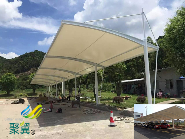 耐候性:廣西省貴玉林市玉州區(qū)膜結(jié)構(gòu)車棚表面有防紫外線的共擠層,可防止太陽紫外線引起的樹脂疲勞變黃;