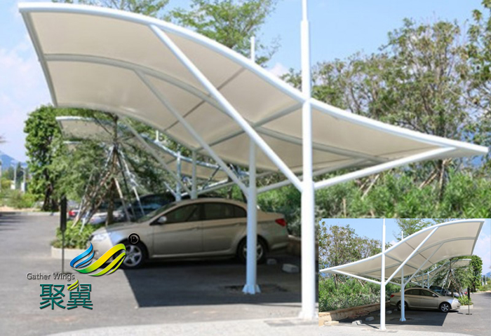 二、膜結構車棚吊裝或張拉膜面的時候,要確保膜面不接觸尖銳物品以防被劃破劃傷,對于膜面提升過程中有可能接觸到的尖銳部位要提前用柔軟物體進行包覆