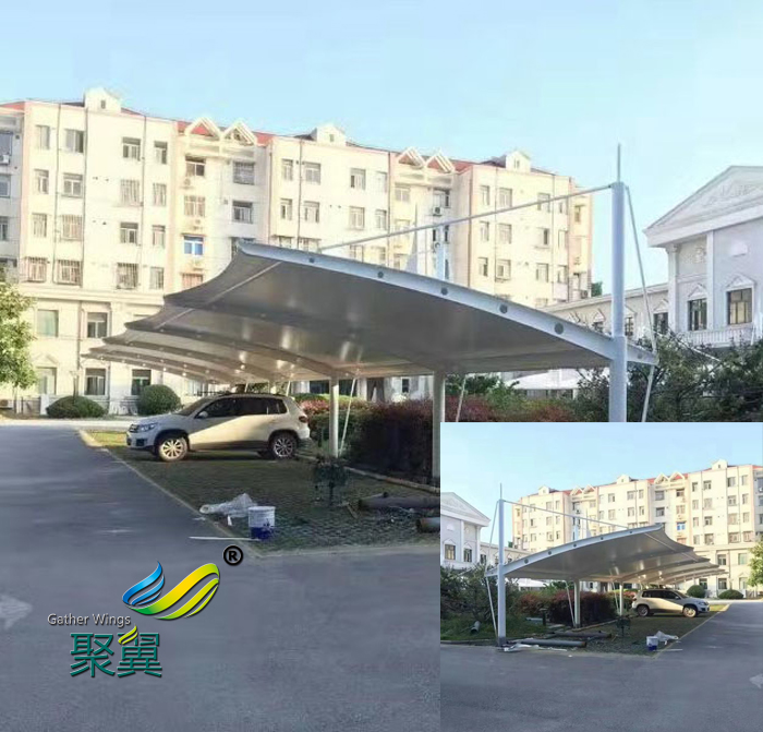 上海膜結構車棚、膜結構充電樁停車棚價格報價品質保障,當下道工序或相鄰工程開始施工時,對膜結構已完成部分必須采取保護措施,防止損壞。無有效保護措施,嚴禁在上海膜結構車棚、膜結構充電樁停車棚膜材周邊2m范圍內做焊接切削作業。張拉時應確定分批張拉順序量值,控制張拉的速度,并根據材料的特性確定超張拉量值。