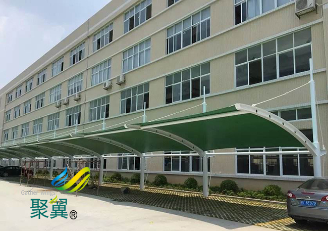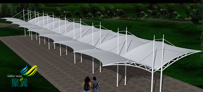 膜結構車棚美觀大方,空間跨度大。較好地體現了膜結構空間跨度大、施工周期短的優點。由于越來越多的膜結構車棚取代傳統的混凝土結構,膜結構車棚的特性越來越受到人們的重視。