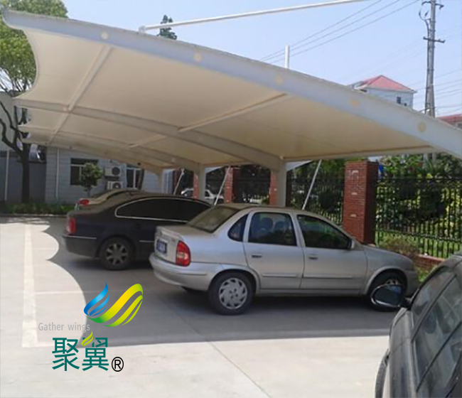 膜結構車棚材料選用了進口結構建筑材料,車棚骨架,表面處理采用進口船用底漆,炳烯酸聚氨酯面漆。由于膜結構車棚高強度的膜材出現,再加上張拉技術的應用,使膜結構車棚抵御風雨的能力是一般雨蓬之類不可比擬的。