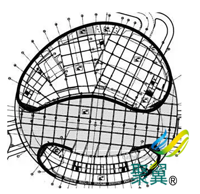 工程地下部分為一個整體結構單元,最大平面輪廓尺寸為直徑約119m的近似圓形。工程地上由六大部分組成,但是這六個部分之間并不是完全獨立的,形成了一個非常復雜的結構體系。具體情況如下: