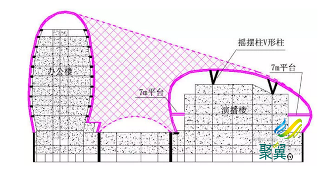 (5)罩在辦公樓與演播樓上的是一個屋蓋外殼鋼結構,見圖4。在地上屋蓋鋼結構從±0.00標高起,將辦公樓和演播樓連為一體。外殼鋼結構主要支承體系有四大部分:1)鋼結構直接落地(圖5中黑粗線部分);2)辦公樓外掛支座(圖6);3)演播樓頂搖擺柱V形柱(圖7);4)空腔部分支承在拱橋上。另外,在演播樓7.0m標高處設有一圈鋼結構平臺,一端與演播樓鉸接,另一端與外殼鋼結構采用滑動支座連接(圖7)。圖8,9為搖擺柱V形柱和7m平臺的施工照片。
