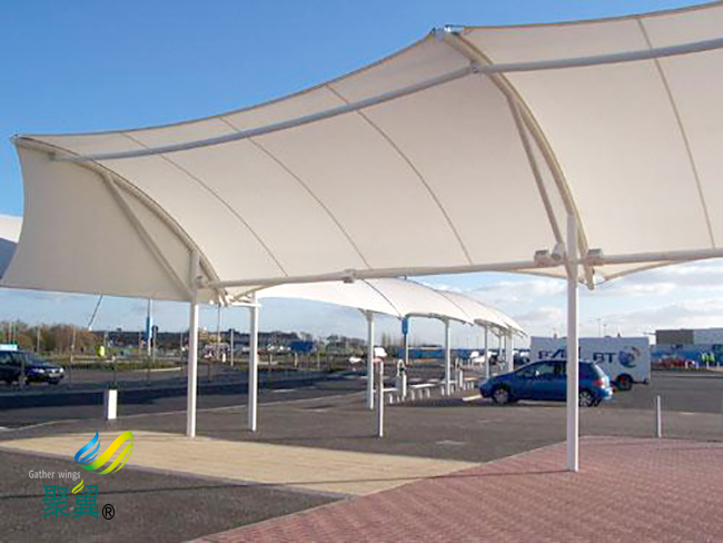 張拉索膜結構藝術性:除了一般??雨蓬不可比擬的實用、耐用、遮風擋雨的功能外,張拉索膜結構雨蓬更是一座雕塑,一件藝術品,給人美的視覺享受。張拉索膜結構柔美,其曲線,其剛柔并濟,其豐富造型,其潔白無瑕,讓人眼前一亮,回味悠長。 張拉索膜結構經濟性:研究表明,長期露天停放的車輛,性能損耗速度比車棚內停放車輛快一倍。而采用張拉索膜結構雨蓬更能真正呵護您的愛車,減緩您愛車的老化速度。 張拉索膜結構耐候性:表面有防紫外線的共擠層,可防止太陽紫外線引起的樹脂疲勞變黃。張拉索膜結構表面共擠層具有化學吸收紫外線并轉化為可見光。