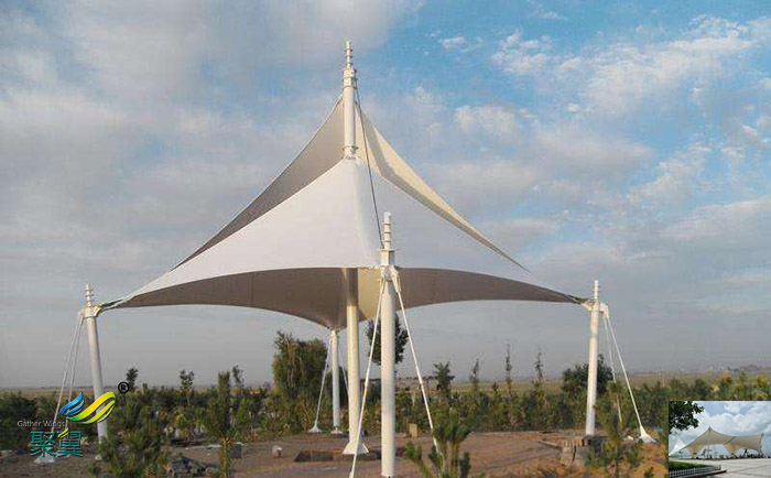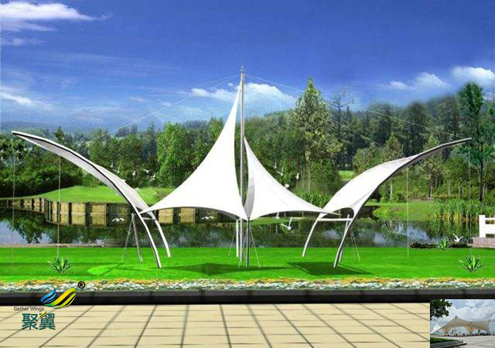 景觀張拉膜能提供豐富多彩的用途,并與園林景觀溶為一體。創造出讓人們盡情享受的快樂空間。充分展示了結構構件清晰受力的藝術之美,它巧妙的整合周圍的環境,給人們一種高貴典雅、浪漫溫馨之感。