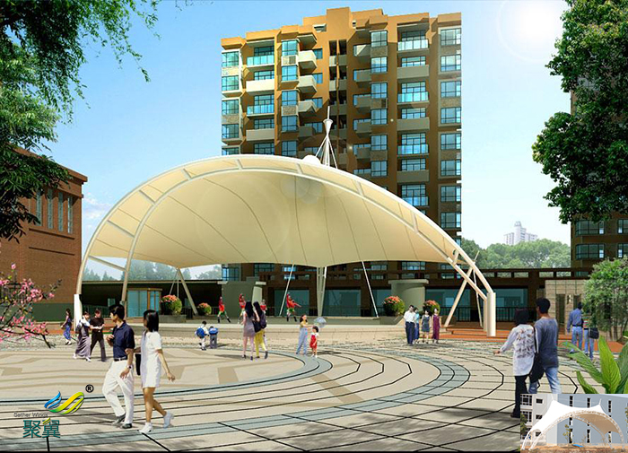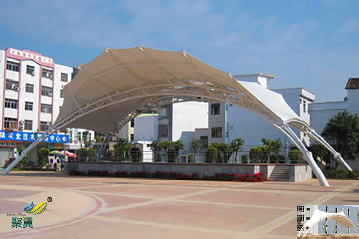 1、舞臺(tái)張拉膜結(jié)構(gòu)的共同曲面外形使其具有激烈的雕塑感,膜面經(jīng)過(guò)張力到達(dá)自平衡。
