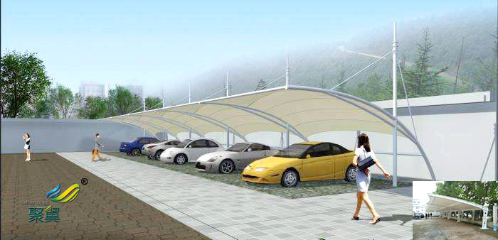 3.膜結構車棚耐候性—表面有防紫外線的共擠層,可防止太陽紫外線引起的樹脂疲勞變黃;
