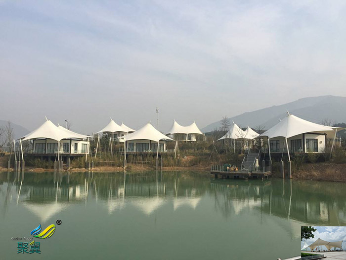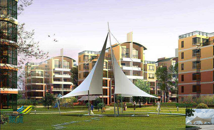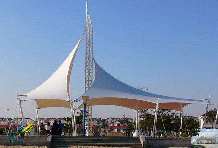 2. 景觀張拉膜結構藝術性:除了通常雨蓬不行比較的實用、經用、遮風擋雨的功能外,膜結構雨蓬更是一座雕塑,一件藝術品,給人美的視覺享受。其柔美,其曲線,其剛柔并濟,其豐富外型,其潔白無瑕,讓人眼前一亮,回味悠長。