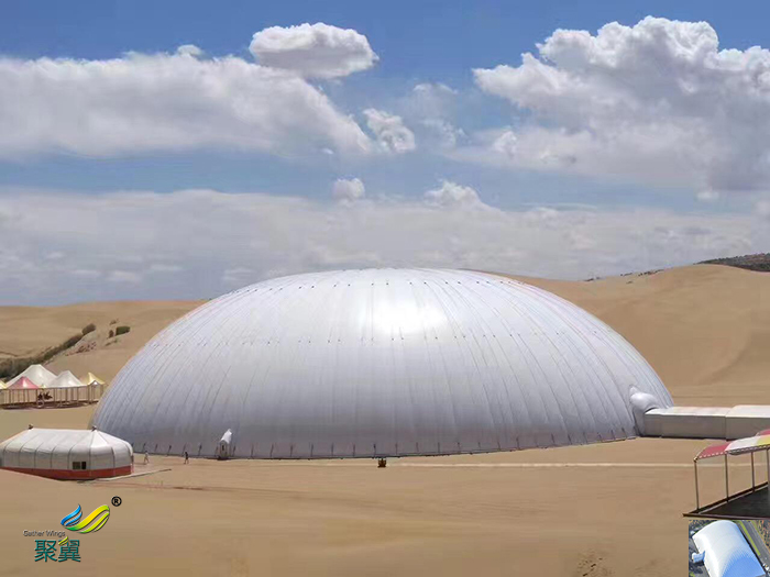 充氣膜結構建筑是國內外膜建筑界推薦使用的最佳節能環保材料。建筑膜材表面涂有PVDF,膜材具有較高的熱反射率和散熱率,并且熱傳導性較低,這極大程度上阻止太陽能進入室內。氣膜建筑膜體安裝簡單快捷,可以作為臨時或季節性建筑,并可以和其他常規結構建筑相連接。