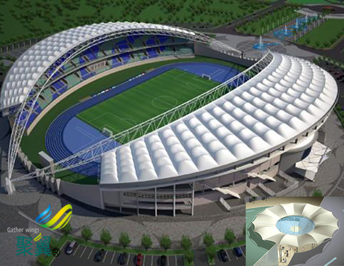 其氣脹式膜結構是單個膜結構件內充氣,使其保持足夠的內壓,多個膜結構件進行組合可形成一定形狀的一個整體受力體系。