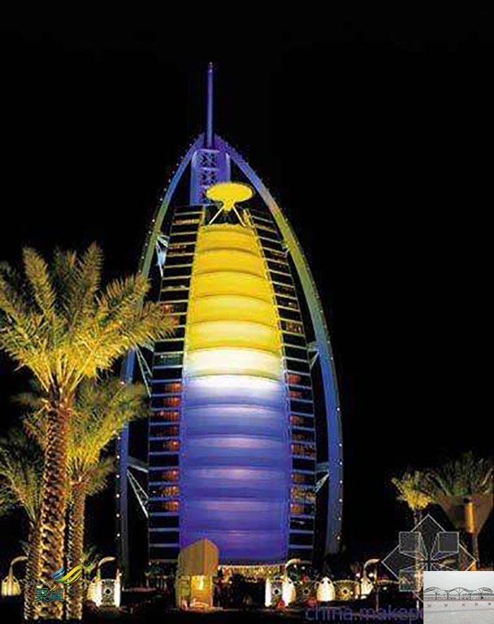 2.充氣張拉膜結構建筑經濟性:由于膜材具有一定的透光率,白天可減少照明強度和時間,能很好地節約能源。同時夜間彩燈透射形成的絢爛景觀也能達到很好的廣告宣傳效益