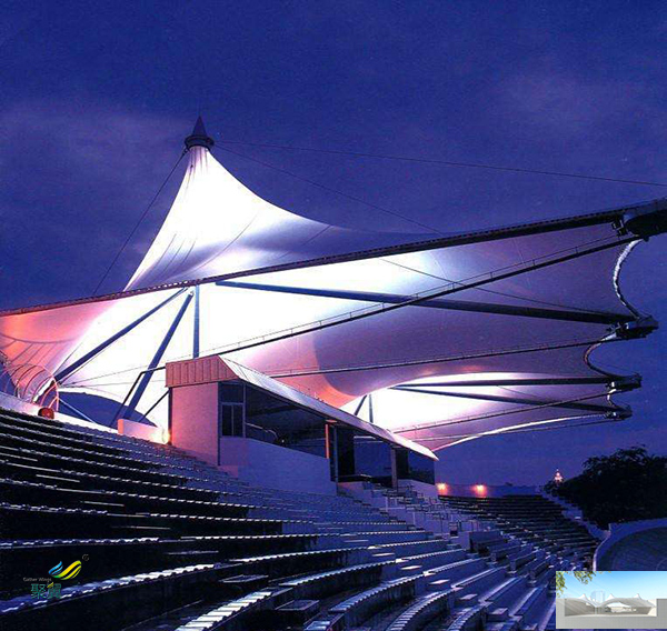 白天,陽光透過膜面使建筑物內(nèi)充滿夜自然漫射光。夜晚,室內(nèi)燈光透過膜面給空增添了夢幻般的夜景。當膜結構用于體育館、娛樂設施時,可以實現(xiàn)全天內(nèi)的舒適相結合的理想的商業(yè)空間。