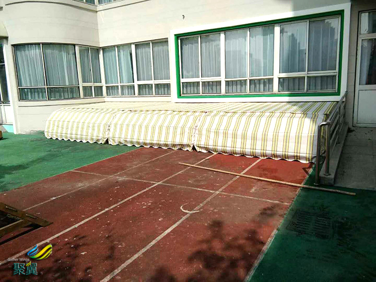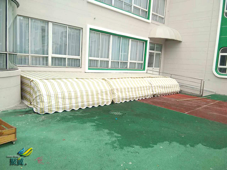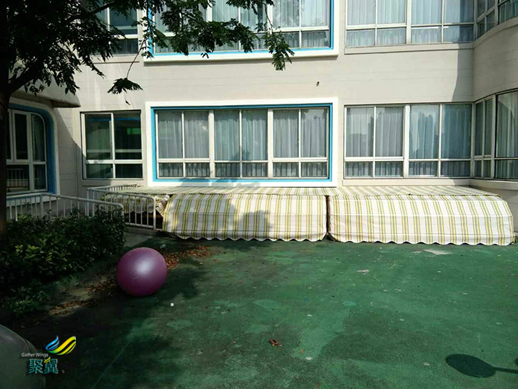 寶山彩虹幼兒園遮陽(yáng)棚具有伸展面積大,可自由伸縮,寬度可任意組合(大可達(dá)36m*4m)等特點(diǎn)。夏日,能使室內(nèi)降低5—7度,省卻了25%的空調(diào)費(fèi)用,使室內(nèi)家具免于日曬而褪色,且能保證空氣流通。