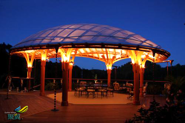 膜結構建筑輕質,張力結構自重小的原因在于膜結構建筑依靠預應力形態而非材料來保持結構的穩定性。從而使其自重比傳統建筑結構的小得多,但膜結構建筑卻具有良好的穩定性。建筑師可以利用其輕質大跨的特點設計和組織結構細部構件,將其輕盈和穩定的結構特性有機地統一起來。