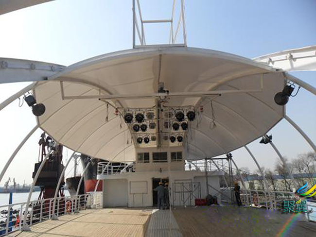 看臺膜結構建筑建筑造價:無柱站臺雨篷、候車室相對于其他結構造價不是高而是低。由于膜結構建筑屋頂較輕,相應減少了主體維護體系、基礎體系的用材量,同時無需二次維護裝修,省去了裝修費用,而且省掉將來很多維護費用,還減少了電能費用。  看臺膜結構建筑建筑環保:膜材的使用減少了空間用鋼量,減少了二次污染,施工現場減少了沙、石料、鋼結構焊接等用量,施工現場很環保,同時看臺膜結構建筑建筑膜結構進現場后只需漲拉就位,施工速度很快。
