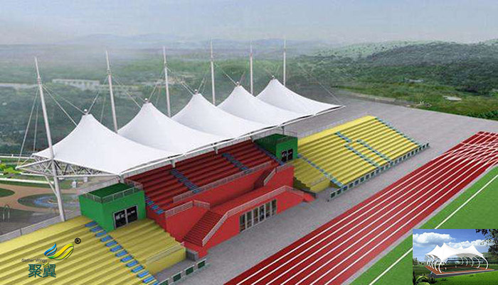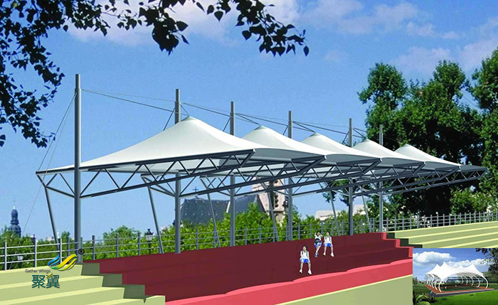 2、膜結構體育看臺建造施工工期短,膜結構加工制造都是在工廠內完成的,縮短了施答工時間,從而也為企業節省了施工成本。