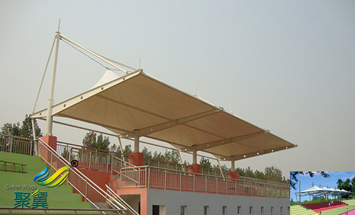 為了解決鋼構(gòu)配合鋁塑板的弊病,膜結(jié)構(gòu)慢慢進(jìn)入了看臺(tái)市場(chǎng),相比傳統(tǒng)的建筑形式膜結(jié)構(gòu)體育看臺(tái)的優(yōu)點(diǎn)很多:首先它不僅滿足了造型的多樣性、夸張性,而且也完美的解決了對(duì)于大跨度結(jié)構(gòu)用鋼量大的問(wèn)題,往往對(duì)于大跨度的結(jié)構(gòu)來(lái)說(shuō),起跨度尺寸就代表著需要大量的鋼結(jié)構(gòu)來(lái)補(bǔ)足,然而對(duì)于膜結(jié)構(gòu)來(lái)說(shuō),其特有的延展性和超高的的抗拉強(qiáng)度完美的解決了大跨度帶來(lái)的困擾,大大的節(jié)約了施工成本。