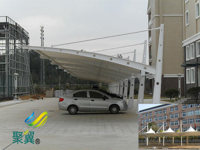 因此膜結構在行業內有“不破玻璃”的稱號。同時成本只有其它結構車棚的一半或者更少。 藝術性:內蒙古錫林郭勒盟太仆寺旗膜結構車棚|最值得一提的是它可以根據支撐構件的位置和高低排列組成不同的形狀,這在金屬車棚上是無法想象的。如在內蒙古錫林郭勒盟太仆寺旗膜結構車棚頂部通過拉伸索,使膜結構布邊沿向上翻起。這要是在彩鋼上只能通過對彩鋼板進行預熱加工才行,需要耗費極大的代價。
