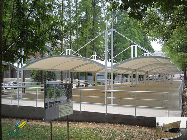 2、膜結構車棚耐用性:由于高強度鋁合金材料,使鋁合金停車棚抵御風雨的能力是一般雨蓬之類不可比擬的。特別是遇到劇烈的暴風雨天氣,鋁合金停車棚建筑巍然不動,毫發不損。可使用15年左右時間。