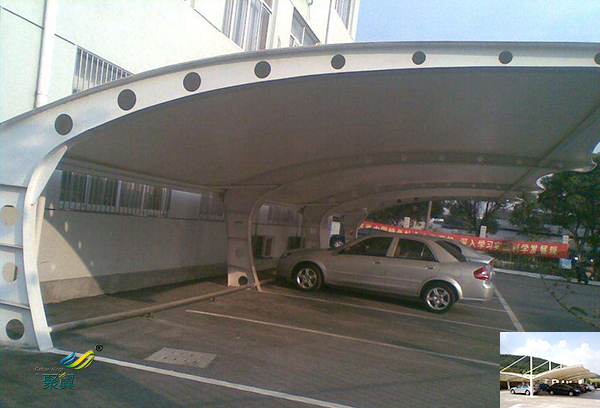膜結構戶外汽車停車車棚膜結構建筑中所使用的膜材料很輕,每平方米的重量只有1公斤左右。因此膜結構可以從根本上克服傳統結構在無柱大跨度建筑上所遇到的困難,可以創造出巨大的無柱大空間。
