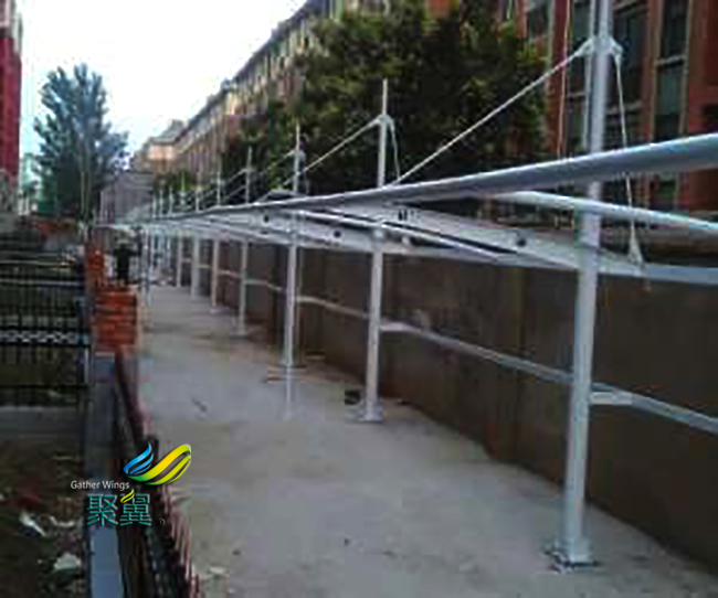 膜結(jié)構(gòu)車棚而且不會(huì)影響從棚內(nèi)看的景觀的視線,而且將人們的生活空間從室內(nèi)延伸到室外,創(chuàng)造出了更加有生活情調(diào)的生活方式。上海外岡鎮(zhèn)周涇村膜結(jié)構(gòu)車棚的篷布材質(zhì)是膜結(jié)構(gòu),而膜結(jié)構(gòu)車棚膜材的最大特點(diǎn)是強(qiáng)度高、耐久性好、防火難燃、自潔性好,不受紫外線影響,藝術(shù)性,經(jīng)濟(jì)性,透光性,耐候性,抗沖擊性,阻燃性,耐溫性,輕便性,隔音性,使用壽命長(zhǎng),一般15-30年。膜結(jié)構(gòu)車棚具有高透光率,透光率為13%,對(duì)熱能反射率73%,熱吸收量很少。