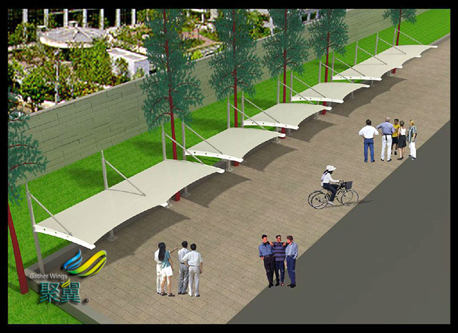 3、膜結構車棚表高強度,延展性好,柔韌性強。這種獨特的性質使這種材料廣泛應用于大幅面,高端精細的商品市場。