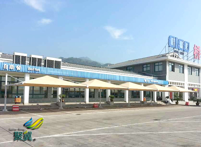 在超細玻璃纖維織物上涂以聚四氟乙烯樹脂而成的材料PTFE膜材,膜結構車棚具有良好的焊接性能,卓越的抗紫外線和抗老化性能,阻燃效果更是引導產品之顛。而在防污能力以及自潔性方面,PTFE膜材更輕松勝出市場同類產品。