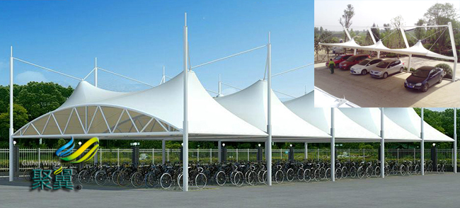 膜結(jié)構(gòu)車(chē)棚是一PVCD等膜材料為主要部件,其主要通過(guò)膜材料的張拉力來(lái)成型固定的輔以少量的鋼支架作為輔助。