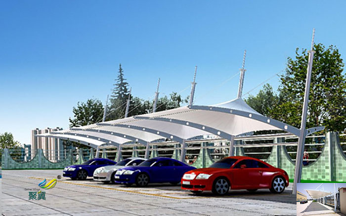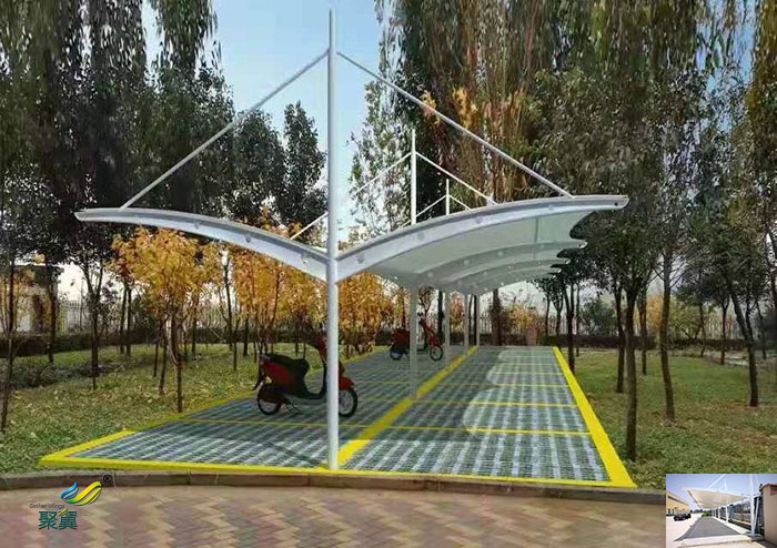 停車棚膜結(jié)構(gòu)頂蓋采用茶色陽光板覆蓋,大棚整體框架鉚接固定在整體框架上,耐酸堿耐腐蝕能力強,保護棚內(nèi)車輛。膜結(jié)構(gòu)車棚內(nèi)使用Φ38鍍鋅管和車棚框架焊接,加強雪松木材的強度,可以讓一個相對意義上的寬敞明亮,膜布車棚費用,停放的車輛很容易,完全符合規(guī)范要求的自行車棚。