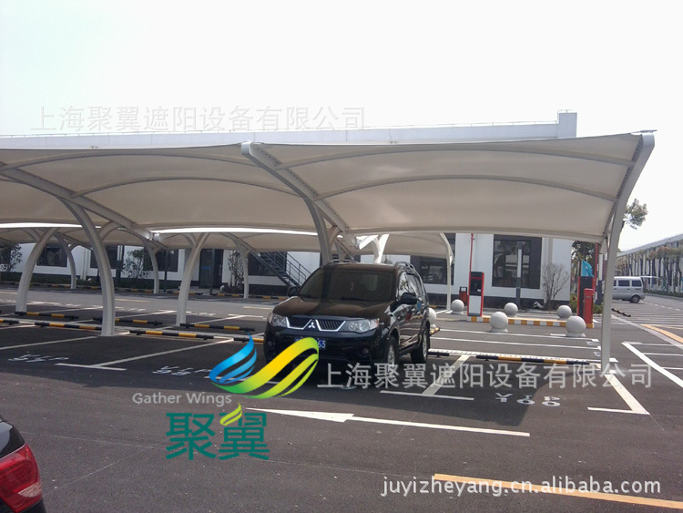 汽車遮陽棚骨架采用鋼結構(國標Q235)鋼管一般厚度在: 5mm 6mm 7mm 8mm 9mm材料制作而成,鋼結構要經過反復加工(切割、打磨、除銹、噴底漆、中間漆、面漆、成品后在做后期處理,從而達到持久不生銹效果), 面料一般膜結構用料選用進口及國產PVC涂層及PVDF PTFE膜材 膜布每平方重:950g 1100g 1200g 其厚度在:0.8mm 0.9mm 1.0mm 1.1mm.