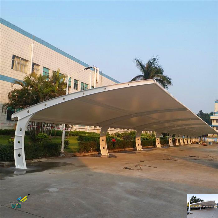 非機動充電樁車棚張力膜結構室內空司的采光系數(即室表里表面天然光日照程度之比)一般可高達10%;而在傳統修建中,光輝只能從有限的采光窗進入室內,其采光系數不到3%。即便在陰天,膜結構室內的光照程度也能夠滿足大多數活動的基礎要求。