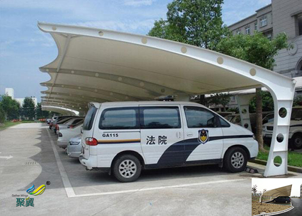 三、膜結構車棚具有極短的施工周期。膜結構車棚的一切設計,加工,制作都可以在工廠完成,在現場只要安裝作業。相比傳統建筑工期縮短了2倍。