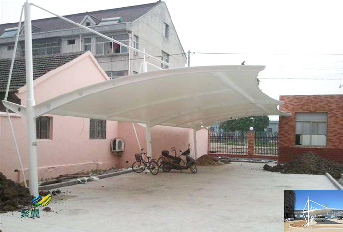 車棚,遍布在咱們生活的各個角落,在很多公眾場合、單位、小區都會安裝很多車棚以供人們停放車輛使用,車棚有很多種,而膜結構車棚以其輕巧別致的造型及優越的性能優點而越來越受人們青睞。下面來談談膜結構車棚施工方案: