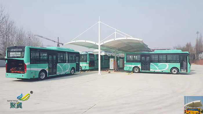 大巴停充電樁車棚其實是有多種的高強薄膜材料和加強構件(鋼架、鋼柱或鋼索)通過一定方式使其內(nèi)部產(chǎn)生一定的預張應力以形成某種空間形狀,作為覆蓋結構并可以承受一定的外荷載作用的一種空間結構的形式。